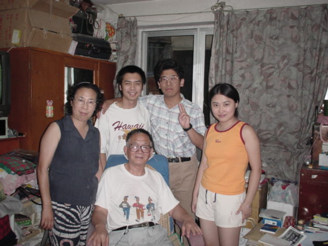張君の家で・・・椅子に座っているのは中国のお父さん。左から、中国のお母さん、張君、私、張君の彼女