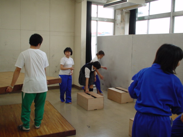 三組の前で。実習の最終日の写真です。 視聴覚室からトンカチの音が・・・・見ると、演劇部の生徒達が。二年生だけじゃなく、一年生もいます。